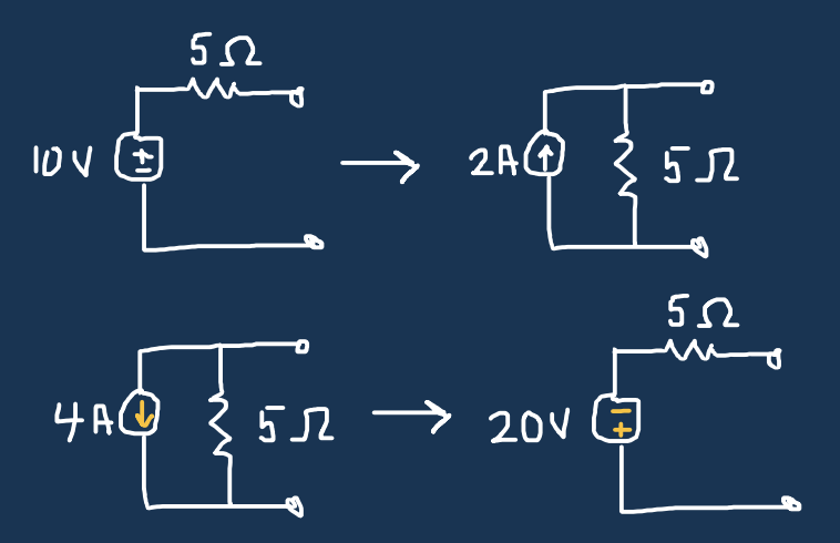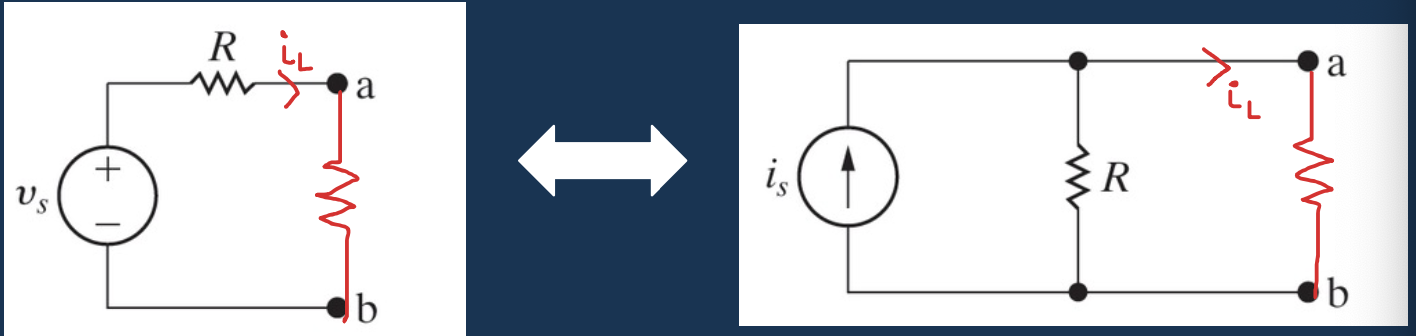 Allows a voltage source in series with a resistor to be replaced by a current source in parallel with the same resistor (or visa versa)