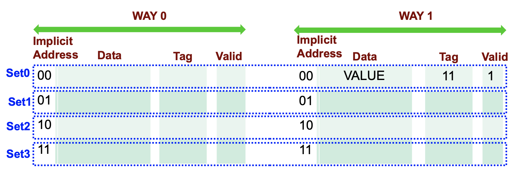 - The last n bits of the address (excluding offset) are implicit based on the row of the cache