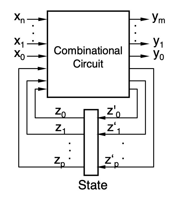 - Just stores the current state and then has a combinational circuit calculate the next value