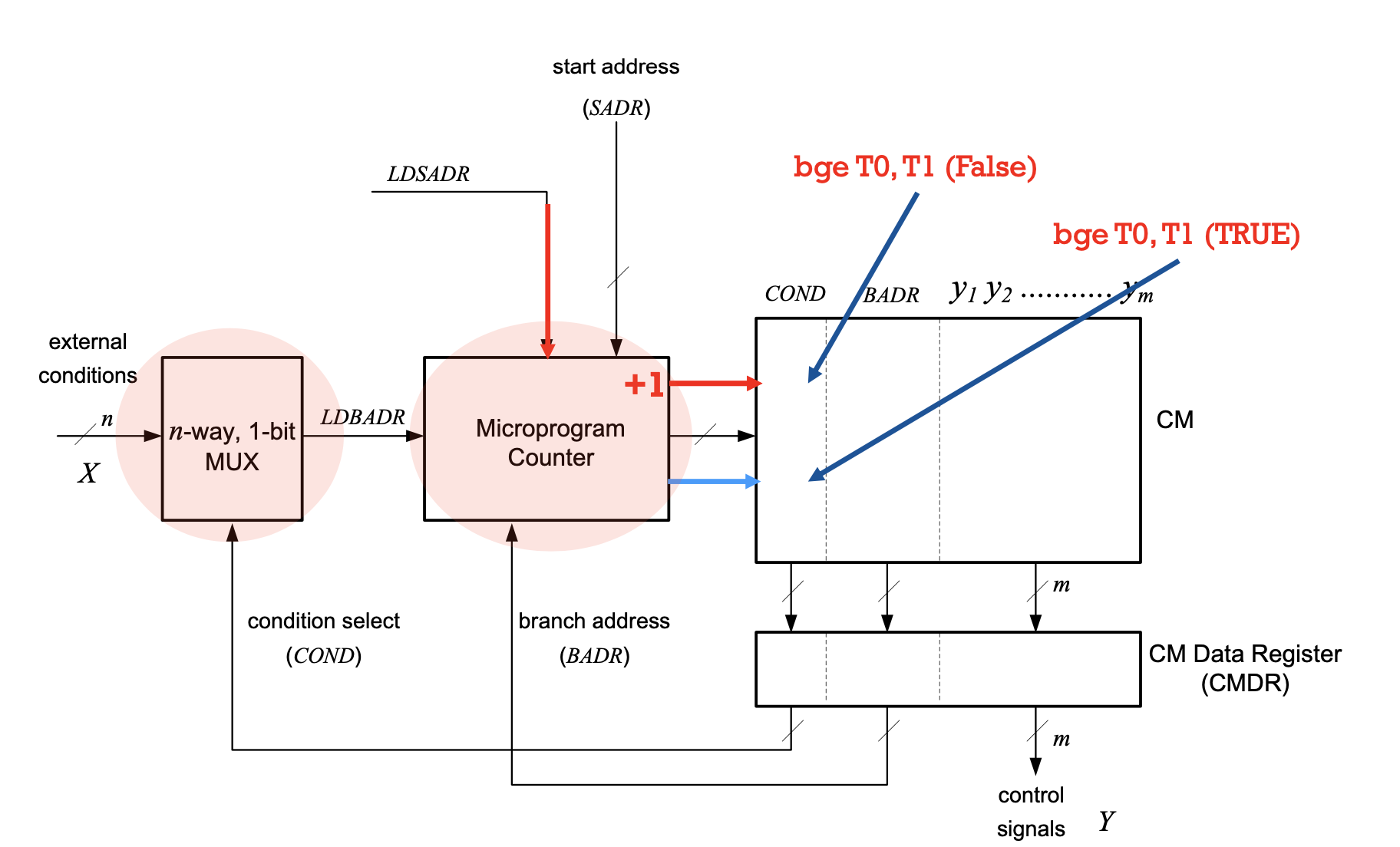 - The micro-sequencer selects the next state based on the input one of the next states as address for the CM (uses a multiplexer)