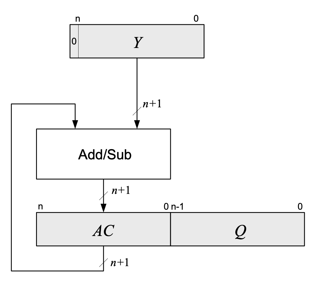 - AC and Y are (n+1) bit numbers in 2’s complement