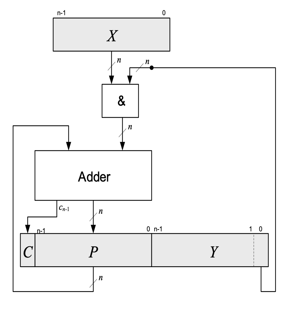 - y′=1 (represented “A”) : P += X then right shift (end of a chain of 1s)