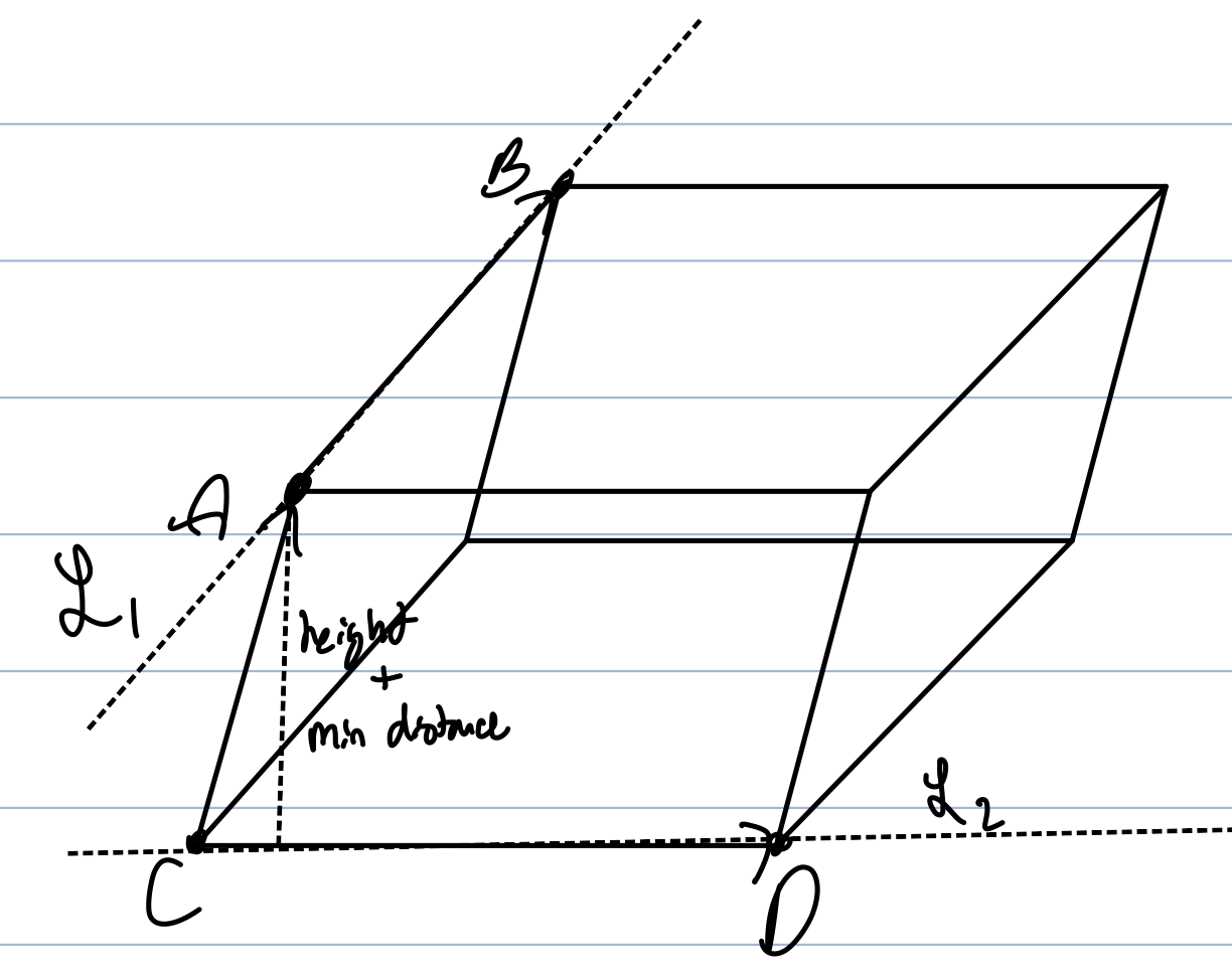 - Finds the volume of the parallelogram formed by the vector and the vector to the point and then divides by width to get height