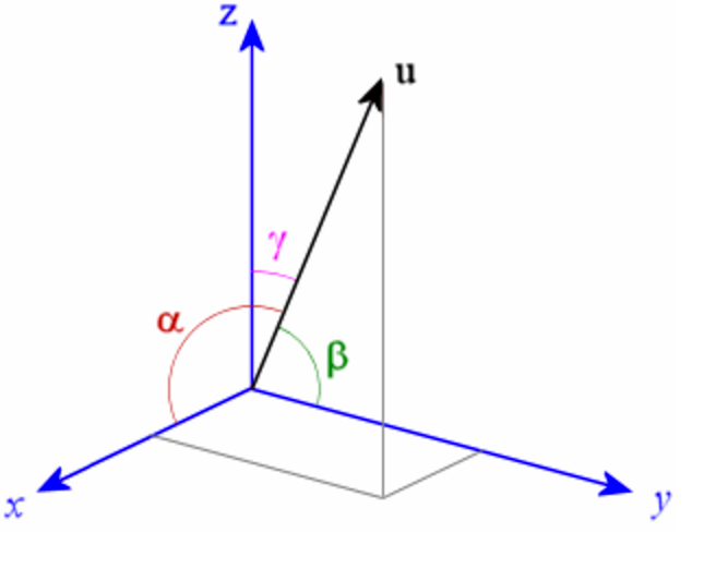 Direction Cosines cosα=∥u∥u1=∥u∥u⋅e^1cosβ=∥u∥u2=∥u∥u⋅e^2cosγ=∥u∥u3=∥u∥u⋅e^3 Properties cos2α+cos2β+cos2γ=1 u^=⟨cosα,cosβ,cosγ⟩